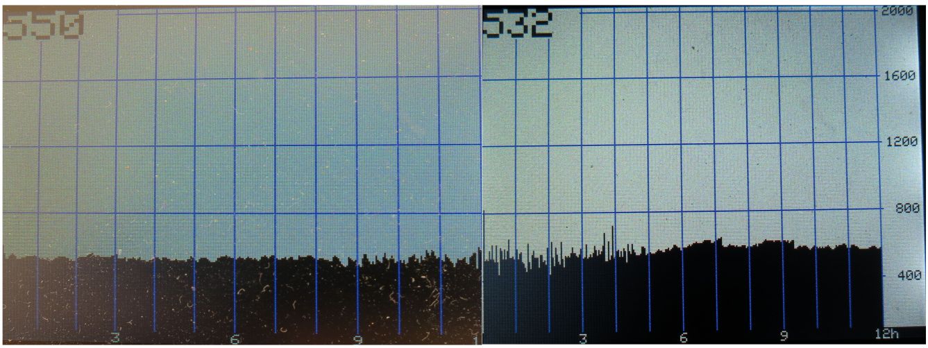 Tras la pantalla inicial, comienza la toma de datos cada dos minutos y medio, que en 12 horas son 288 medidas. El sensor requiere un tiempo para calentarse y estabilizar las lecturas. En los primeros minutos las cifras no son fiables.