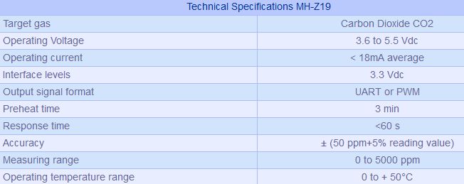 Este medidor está basado en el sensor MHZ19B que mide hasta 5000ppm. Tiene una excelente sensibilidad y precisión. Se alimenta a 5v y tiene salida de datos por serie y PWM. La gráfica del montaje la he limitado a 2000ppm, aunque continua marcando las cifras numéricamente en pantalla.