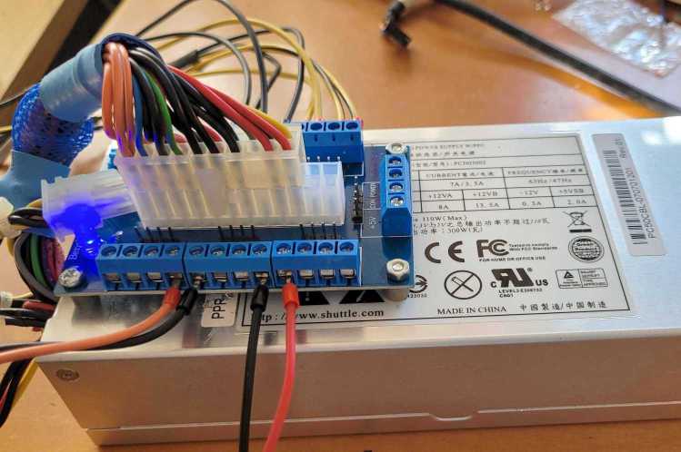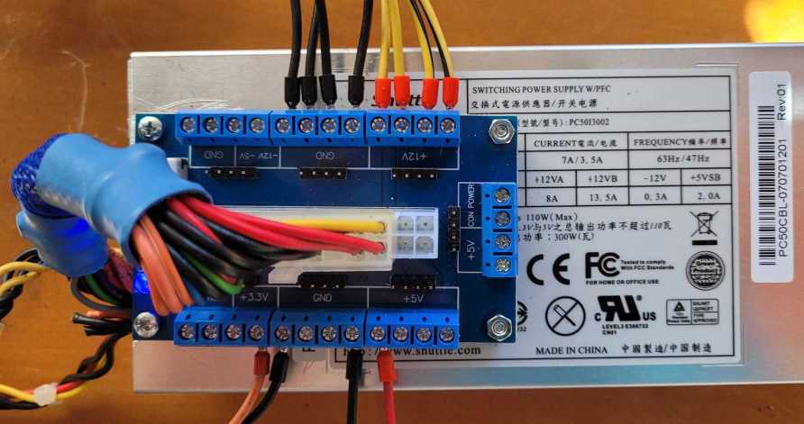 Lo encontré en Aliexpress como Adaptador de corriente ATX DC de 24/20 pines. Aparte de las salidas atornilladas, tiene númerosos conectores tipo espadín.