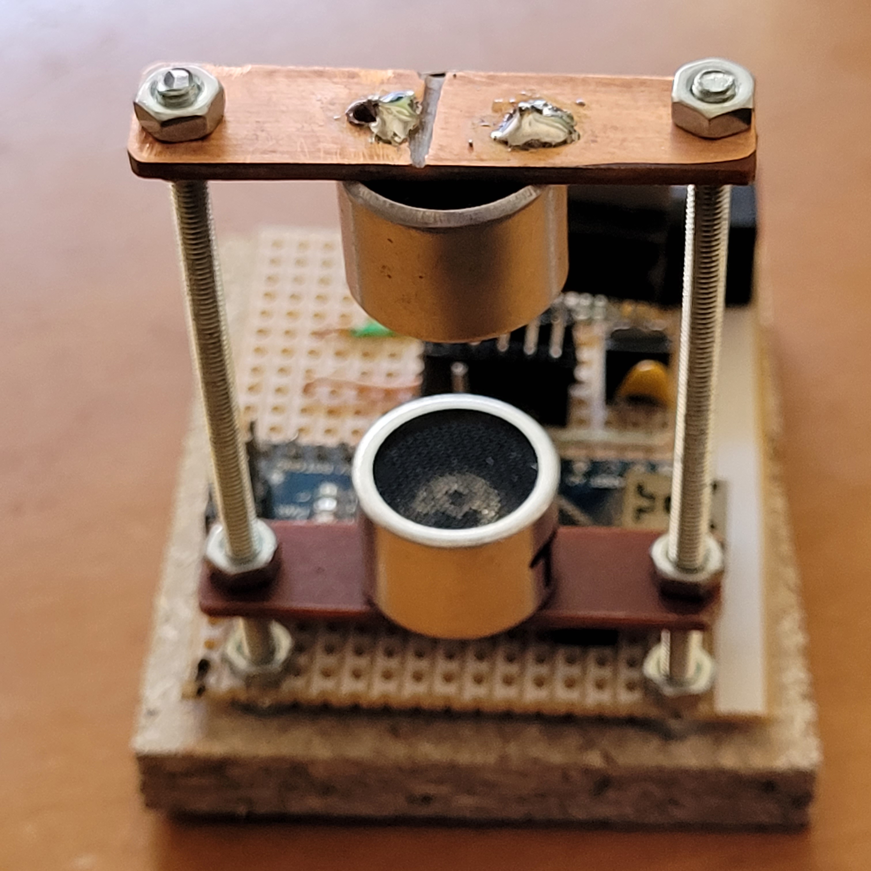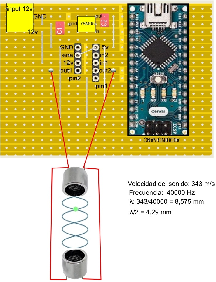 He usado un Arduino nano, el L298 está instalado sobre una especie de zócalo hecho con los conectores que habitualmente tiene el Arduino Uno en los pines. Las dos salidas del L298 están unidas por debajo de la placa a las varillas roscadas que sostienen los dos transductores, que están sujetos con dos trocitos de circuito impreso que deben ser perforados estando totalmente unidos para que luego queden perfectamente alineados el uno con el otro. La distancia entre los transductores la he puesto a 21,7mm.