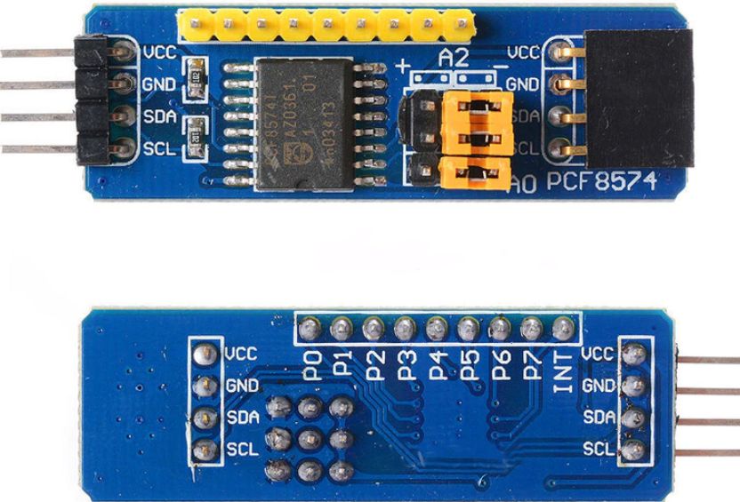 El CI PCF8574 es un expansor de 8-bit de líneas de entrada y/o salida a interfaz I2C. Es decir con solo dos hilos SCL y SDA podemos controlar ocho líneas. Funciona entre 2,5 y 6 voltios. Las salidas pueden controlar directamente LED (25mA). En el arranque, todas las líneas (p0-p7) están en alto. Con los A0, A1 y A2 podemos definir su dirección. Yo he usado un módulo ya ensamblado con dirección 0x20.