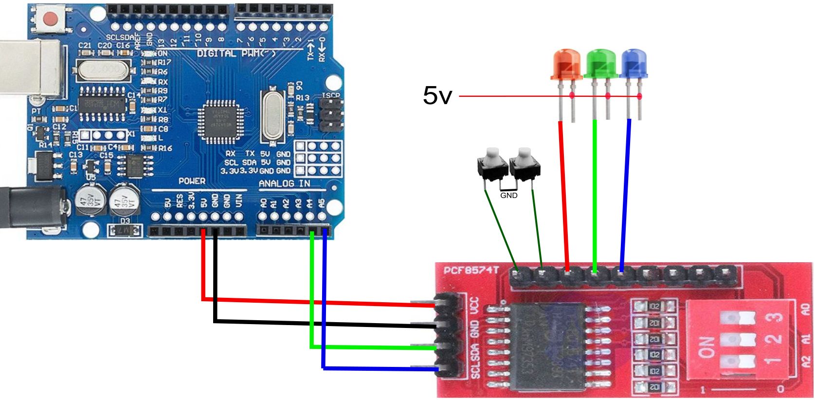 Recordar que por defecto los 8 pines del PCF8574 está a nivel alto, por eso los LED están conectados al positivo y estarán apagados. Al poner un pin a masa se encenderá.