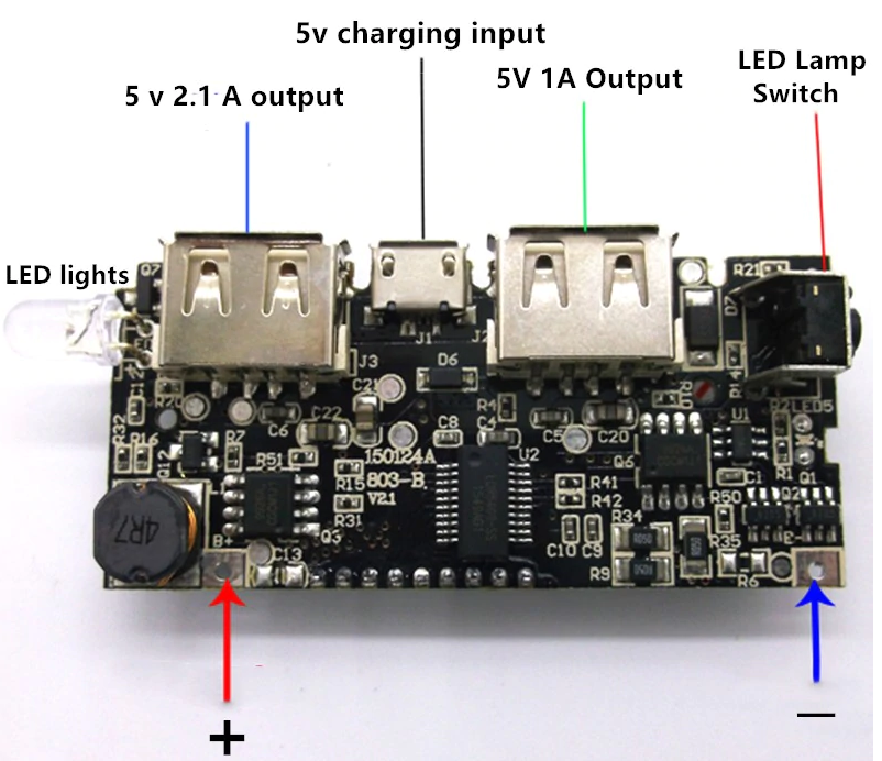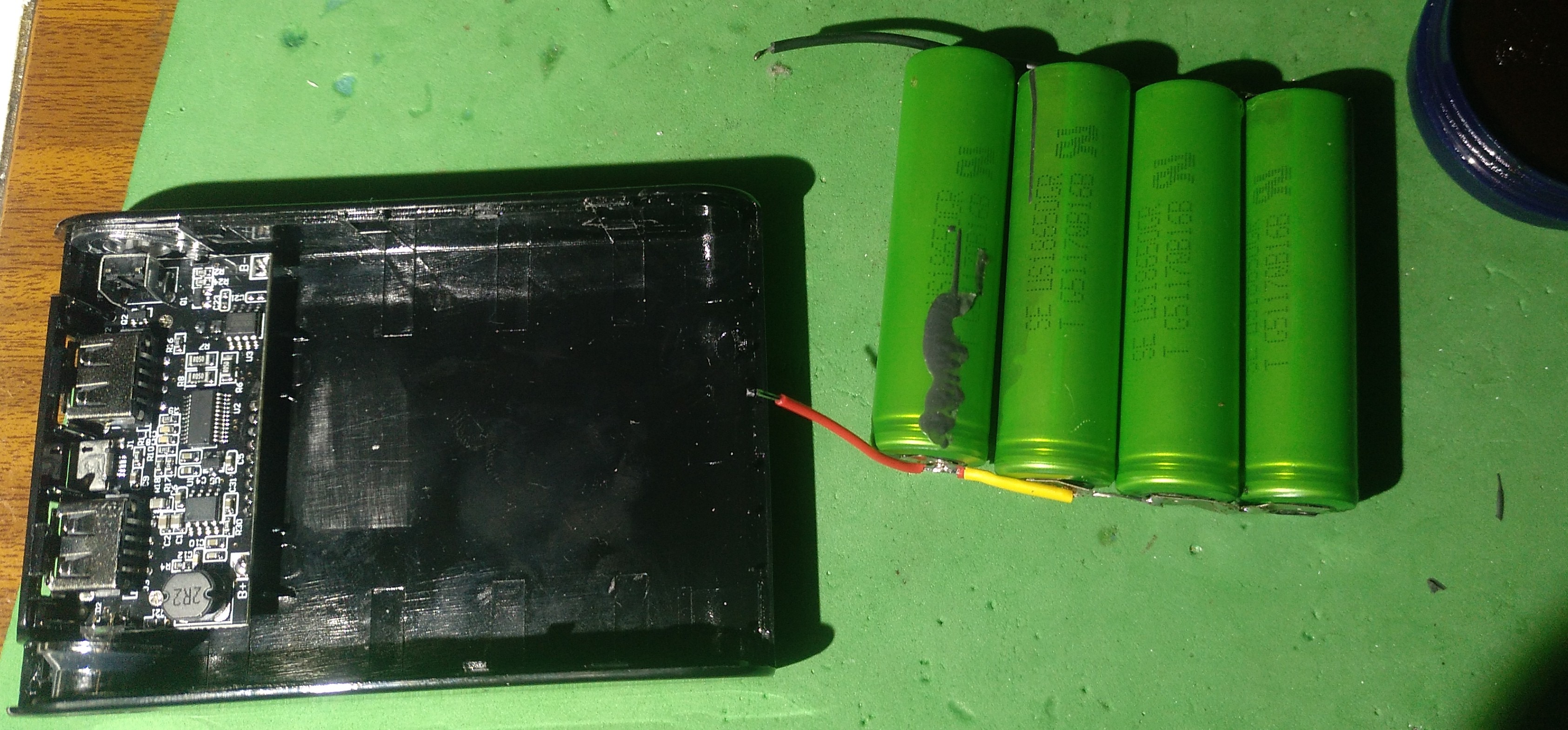 Las pilas rescatadas de portátil suelen venir soldadas dos a dos en paralelo. En total unir 4 pilas, TODAS en paralelo dando una tensión 3,7v. El circuito controlador se encarga de elevar y estabilizar el voltaje a 5 voltios.