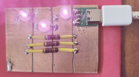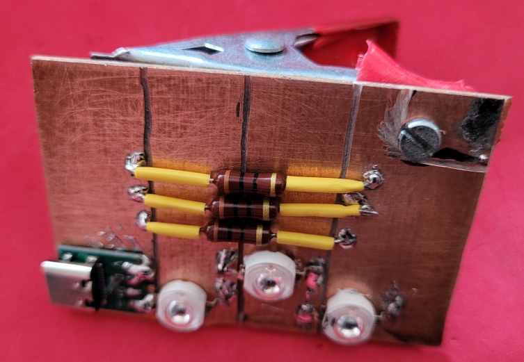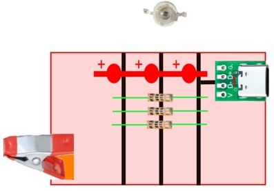 He usado 3 diodos infrarrojos de 850nm y 3w, 3 resistencias de 100Ω, conector hembra USB C, pinza y trozo de placa de cobre.