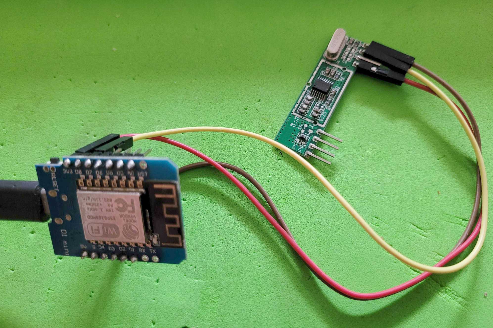 Solo necesitamos un esp8266 y un módulo receptor de la frecuencia 443Mhz. Con estos elementos, leemos el código identificativo del sensor y que nos servirá de filtro para que el esp8266 nos mande una llamada a través de Telegram cuando detecte que ha sido activado.