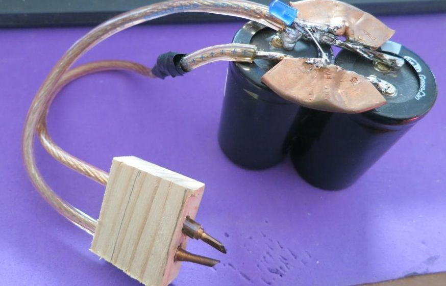 Un soldador de puntos para soldar terminales a pilas de litio. Evidentemente es para un uso esporádico. He usado dos supercondensadores de 500F en paralelo. Permite soldar una pila con varios puntos. Se podría prolongar su uso cargándolo simultáneamente con una fuente de 2,7v y al menos de 2 amperios.