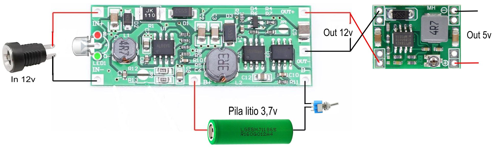 Decidí añadir un interruptor para desconectar la pila si no vamos a usar el sistema largo tiempo para evitar su descarga ya que el circuito UPS y el Step Down tienen un consumo aún sin carga (aunque es mínimo). He conectado los dos cables de salida directamente a los módulo y terminan en los correspondientes conectores para 12 y 5v.
