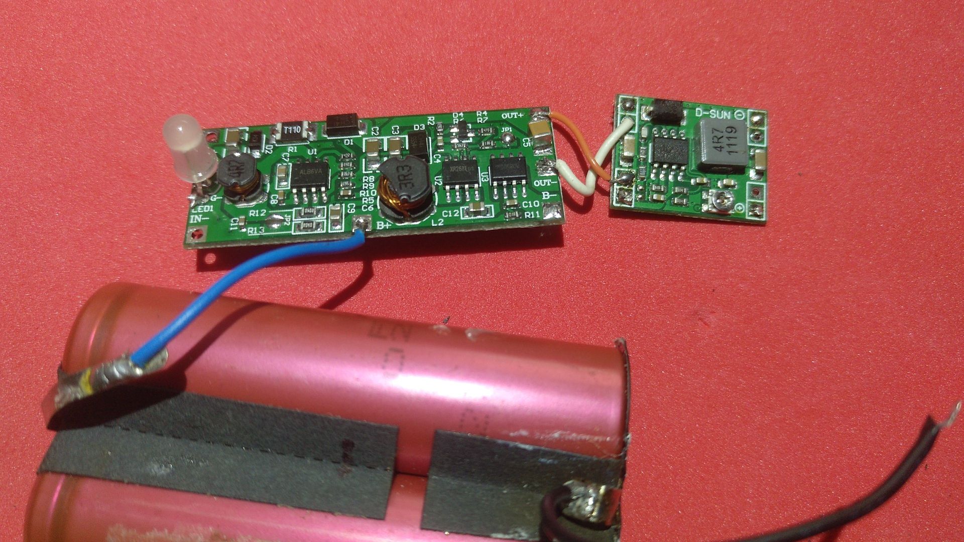 Los componentes son el módulo UPS con salida de 12v (comprado en Aliexpress), un Step Down para bajar de 12 a 5v, pilas de litio, diodo bicolor de ánodo común (yo tenia uno RGB y corté la patilla del azul).