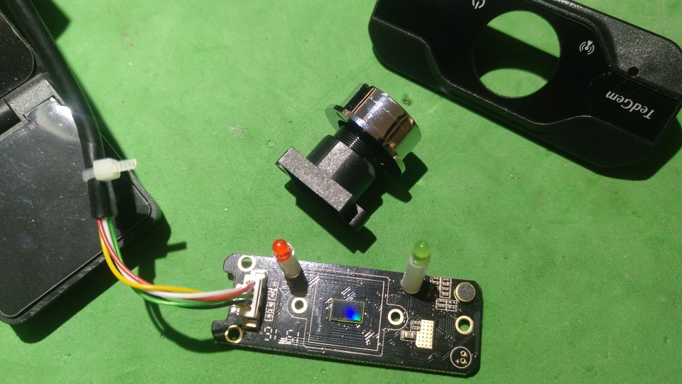 La cámara es muy fácil de desarmar. El panel frontal saltan las pestañas con un pequeño destornillador y toda la circuitería y lente salen quitando tres tornillitos de estrella. En la foto izquierda aparece sin lente, solo con el soporte de esta. El caso es que hay un pequeño problema y es que para evitar su desenfoque accidental, la lente esta pegada a su soporte que a su vez va atornillado a la placa.