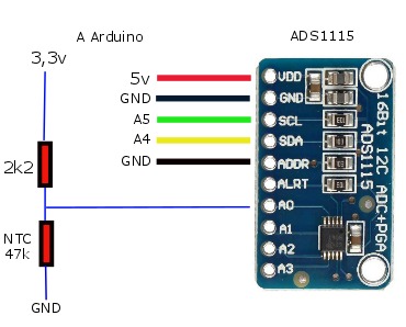 Se trata de comparar a nivel práctico las capacidades de los conversores de 10 bits Analógico a Digital (A0-A5) del Arduino con uno de 16 bits como el ADS1115. El ADC del Arduino permiten descomponer una señal analógica en 1024 muestras (210) mientras que el ADS1115 lo hace 32768 (215) ya que un bit se reserva para el signo, lo que permite leer valores de tensión negativos. Realiza 860 muestras por segundo a través del bus I2C. Esta precisión es útil cuando se trata de medir valores con cambios muy rápidos o con variaciones muy pequeñas de tension. El chip tiene cuatro entradas pero puede usarse dos a dos como diferencial. Además puede configurarse con diferentes amplificaciones (hasta x16) para aumentar señales débiles. Funciona entre 2 y 5,5 voltios. Permite seleccionar fácilmente 4 direcciones I2C. En los Sketch se ha utilizado la librería Adafruit