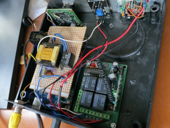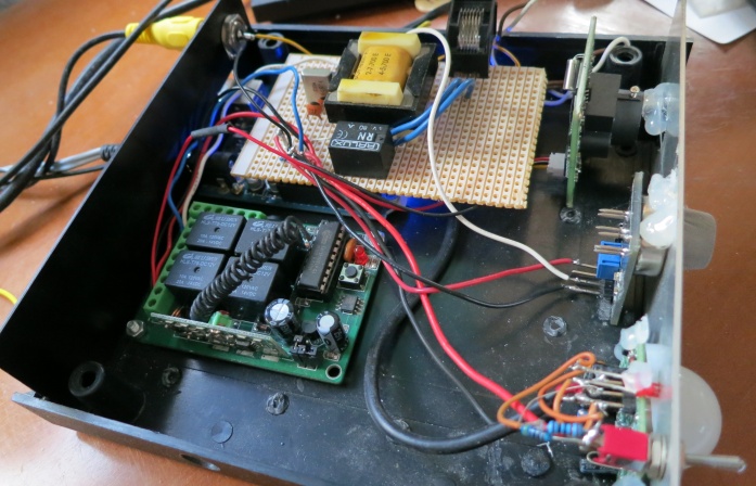 En primer lugar hay un relé a la derecha que representa el del receptor del mando a distancia. El resto del circuito esta hecho en una placa que se acopla encima del Arduino (puede hacerse separada).