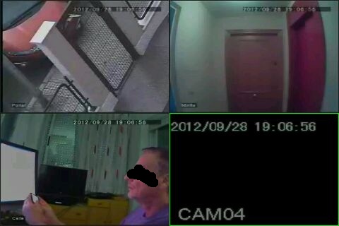 En la izquierda el montaje ya terminado. En el fondo se ve una pantalla para ver fotos, que afortunadamente tiene entrada de video y está conectada a la salida de video del DVR. La caja y esta pantalla están en mi "despacho". Por cierto, tengo otro mando con el receptor metido dentro del telefonillo (fonoporta) y puedo abril la entrada al edificio sin moverme del sillón ya que veo quien llama. Vale vale alto, en mi descargo tengo que decir que tengo movilidad reducida.