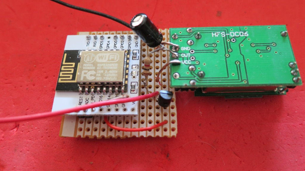 El funcionamiento es muy simple. Cuando el sensor microondas detecta una presencia, su salida (pin central) pone en conducción el 2N2222 que alimenta el esp8266 y su programa nos envía una alerta via Telegram. La salida del sensor debe regularse para al menos 40 segundos, tiempo suficiente para que esp8266 conecte con nuestro router y envíe el mensaje telegram.