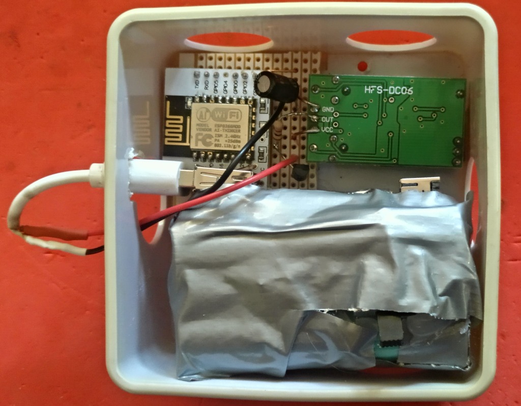 El montaje alimentado con pack de pilas recicladas y colocado en la puerta. Se debe regular la sensibilidad para que detecte personas que se acerquen mucho al sensor de forma no habitual y que podrían estar manipulando las cerraduras. La puerta era blindada pero en la parte lateral no, por lo que el sensor podía funcionar. Apuntar que en este caso, la mirilla del domicilio esta conectada a internet y es visible en el móvil en caso de recibir la alarma Telegram.