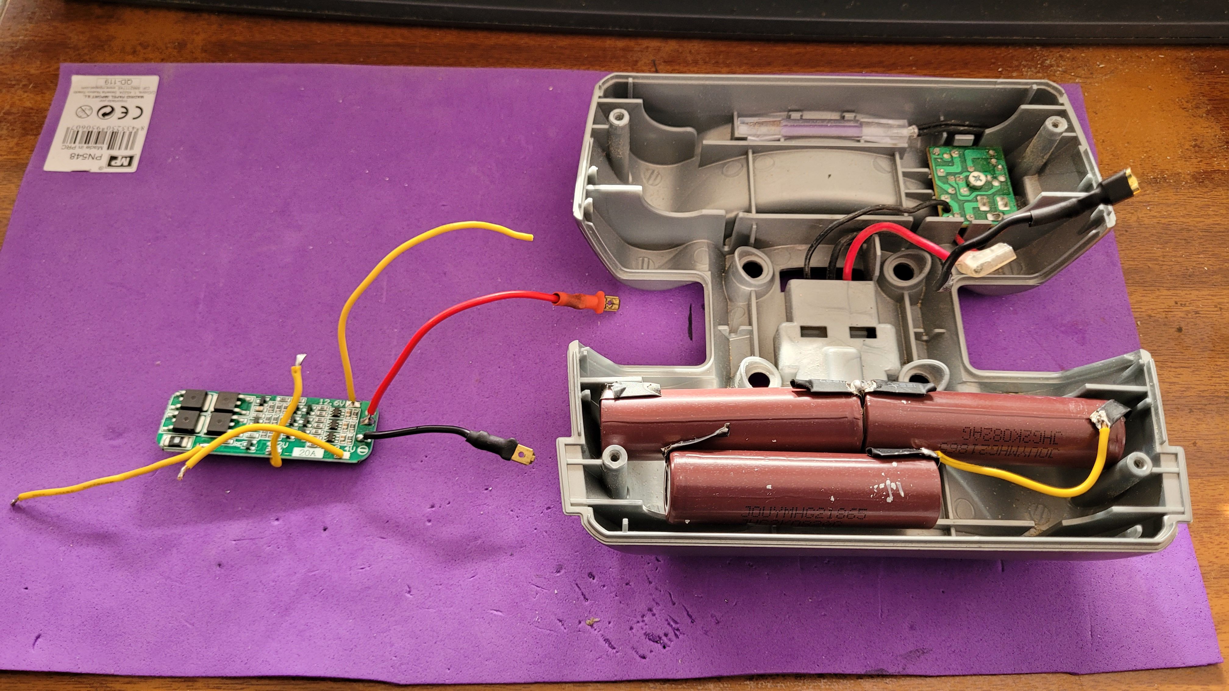 Las baterías de litio se cargan por la misma entrada que las antiguas de Ni-MH, pero no necesitan el cargador integrado. He cambiado el cable rojo del positivo para conectarlo directamente al conector de entrada. Se usa un cargador de litio de 12,6v.