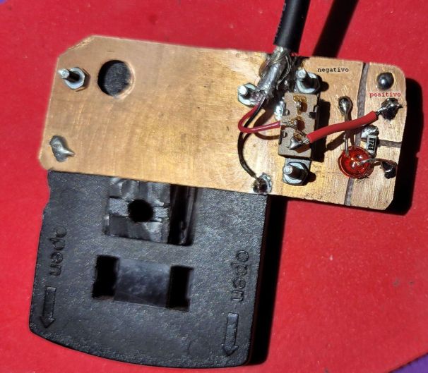 El interruptor, resistencia (SMD) y el LED están soldados en una plaquita de circuito impreso, así como los cables que vienen del powerbak y los que van a la cámara.
