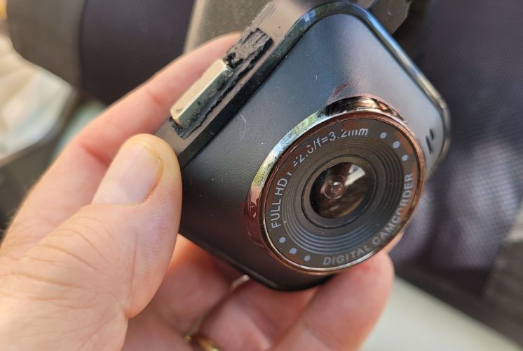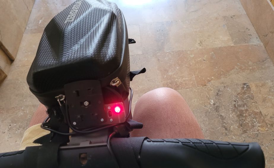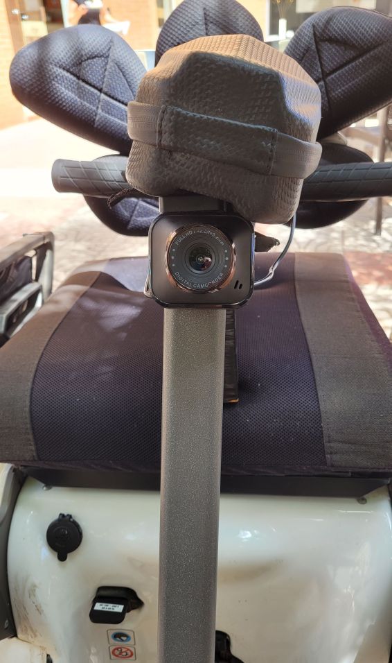 Se trata de la instalación de una cámara en el frontal de la silla. Es del tipo DashCam (la típica de los automóviles) lo que significa que la cámara comienza a grabar en cuanto recibe alimentación y se para al cortarla, pero no se corrompen los ficheros porque la cámara dispone de una pequeña batería y los cierra correctamente.