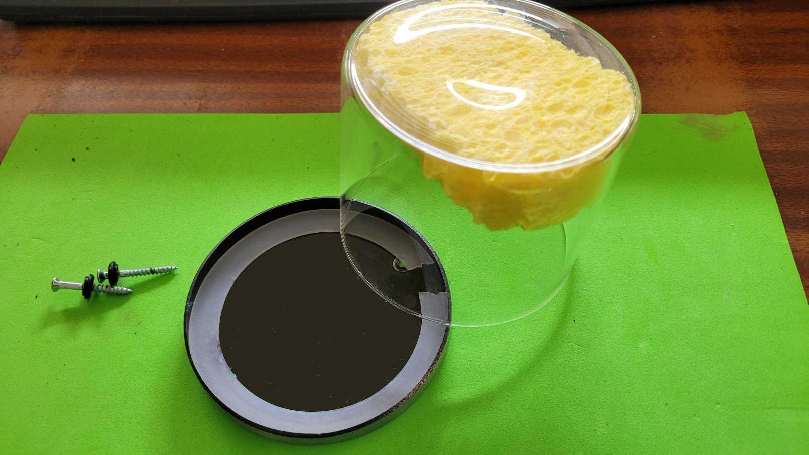Bote de cristal. De la tapa eliminé un plástico interno para dejar libre el aluminio. Esponja encajada en el fondo para poner un chorro del alcohol isopropílico.