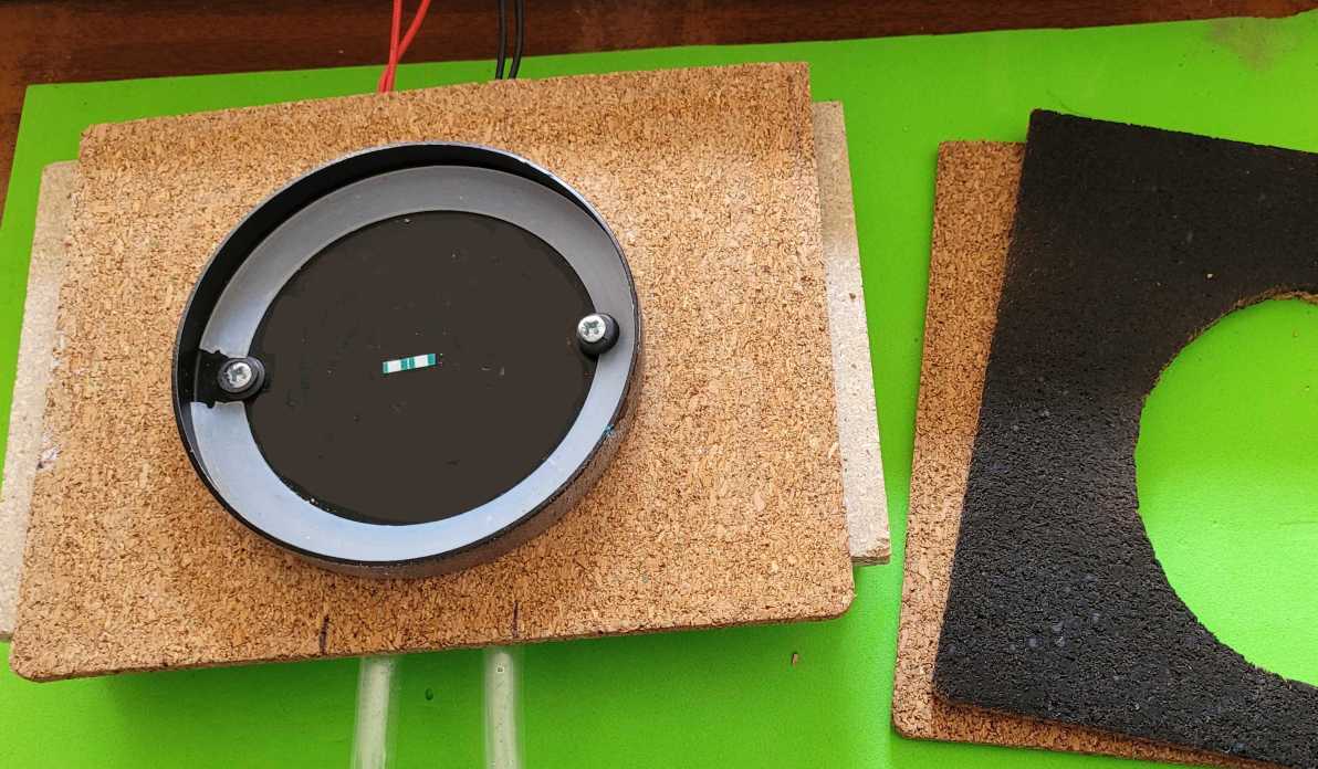 -Corcho, maderas, bote de cristal con tapa metálica y spray negro del chino de España. -Refrigerante de aluminio, tubo de goma, pasta térmica y alcohol isopropílico de Amazon. -Dos placas Peltier de 10A (TEC1-12710) y bomba de agua del chino de Chinalandia. -Fuente vieja de PC. -Piedrecita de mineral radioactivo que yo llamo Uraninita pero que no sé su composición exacta ya que emite otras partículas además de alfa y que compré por eBay hace muchos años. Usando este mineral permite ver muchas más trazas por minuto que si solo esperamos las de radiación de fondo (que suelen ser de unas 21 por minuto contadas con este montaje geiger anterior.