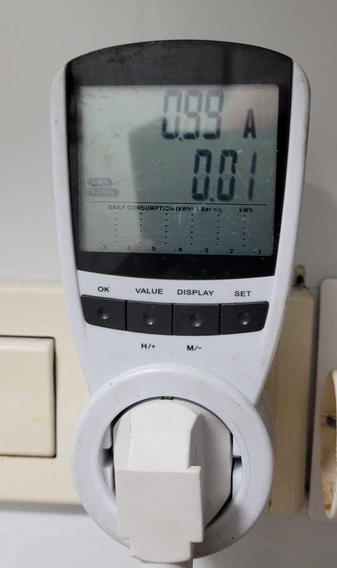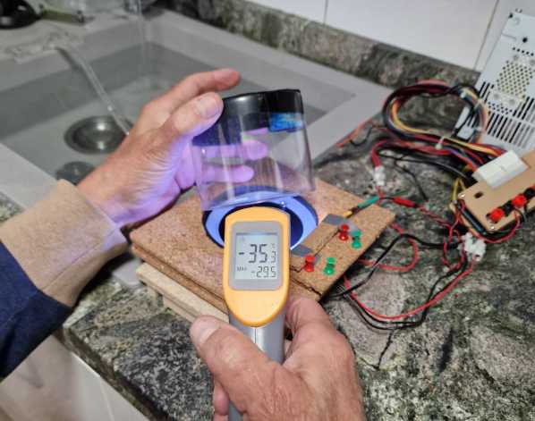 Temperatura de -34,6ºC. En otras mediciones recién quitado el cristal marcaba -38,5ºC. Vemos que para conseguir estas temperaturas el consumo es tremendo. Casi 1 amperio, es decir 230W. Útil, pero muy ineficaz. Y además usando agua de refrigeración con hielo.