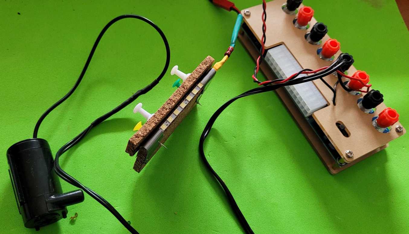 Bomba de agua y tira de mini LEDcon resistencia. Piedra de "uraninita" con su cofre de plomo.