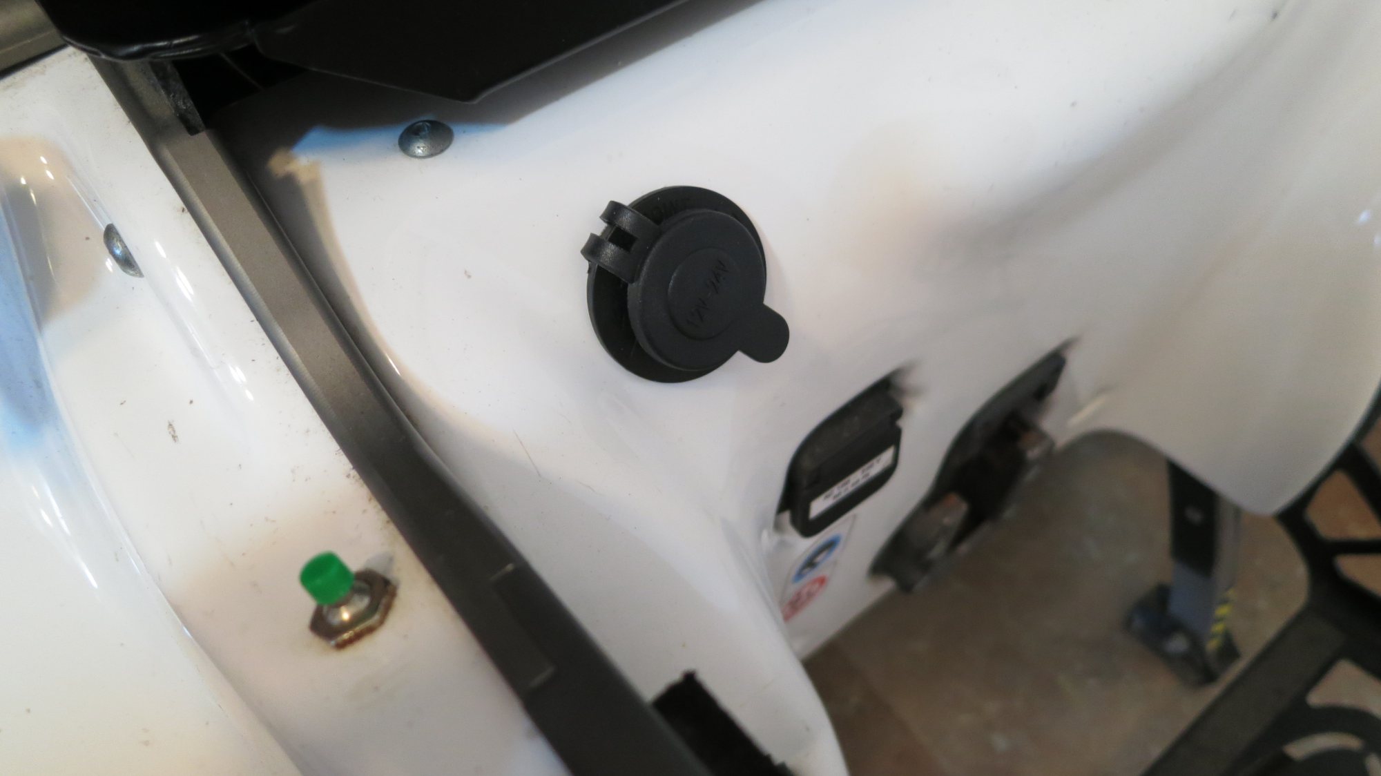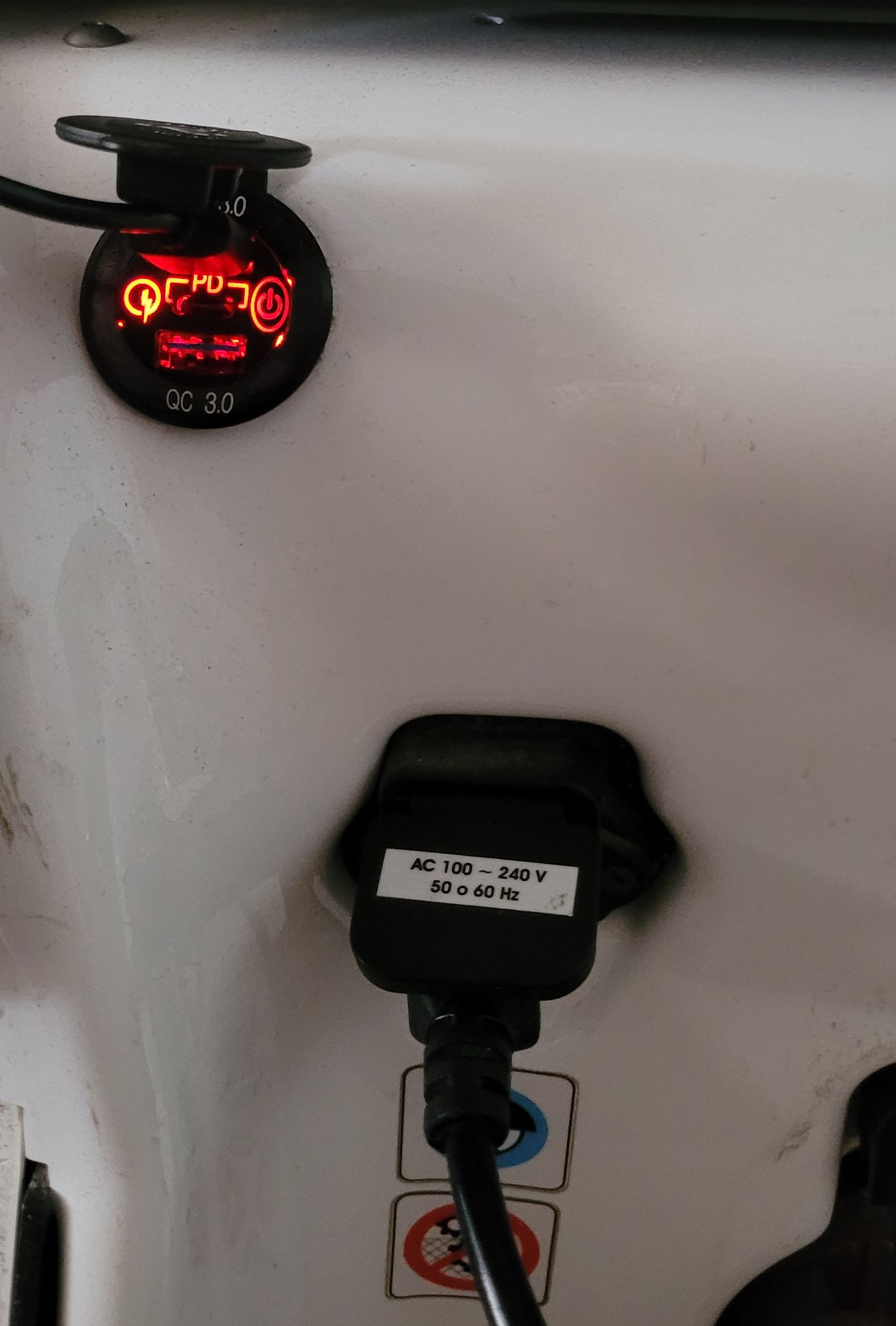 Pues eso, un cargador para móviles, tableta o cualquier otra cosa a cinco voltios. Hacer el taladro, el cargador va con una rosca por detrás. Se sueldan los terminales con la batería de 12 voltios de la Genny ¡¡respetando la polaridad!!. Se enciende con un interruptor táctil y tiene tres salidas, dos USB normales y una USB tipo C Con el enchufe. ¡OJO!, cargar un móvil no representa mucho, pero no podemos abusar y hemos de vigilar la carga de la batería con el voltímetro de la Genny ya que es la encargada de subir y bajar las patas.