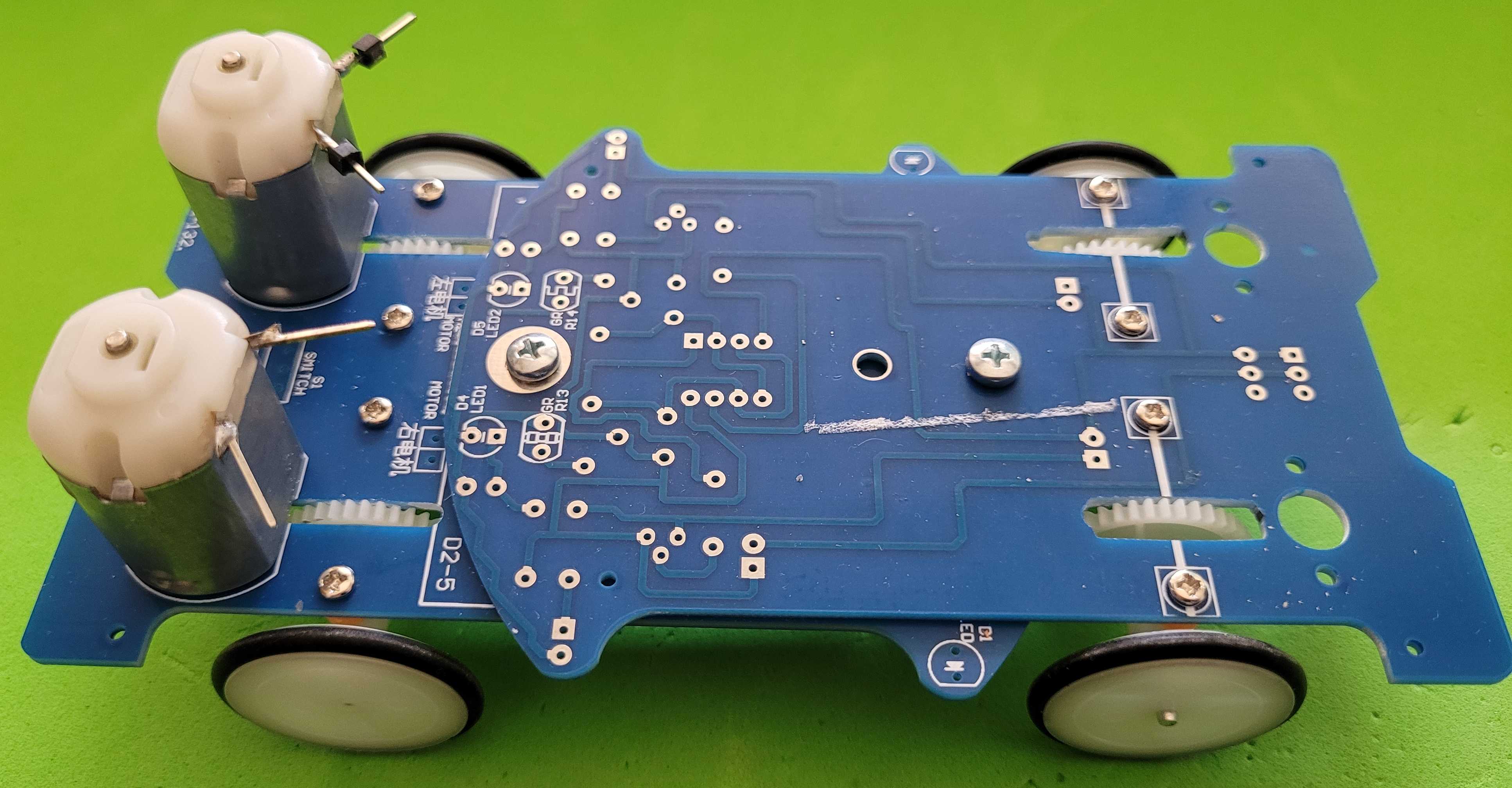 Aprovechando el bajo precio (1,67€) del cochecito en formato de kit, pedí dos que uní por el centro. Solo uso la placa, motores (3v) y ruedas.