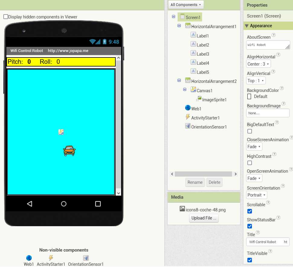 Esto es el montaje de un carrito controlado con el sensor de orientación de un teléfono Android. No es perfecto (ni se pretendo) ni en hardware ni en software. Solo en plan demostrativo y a perfeccionar por los más interesados.