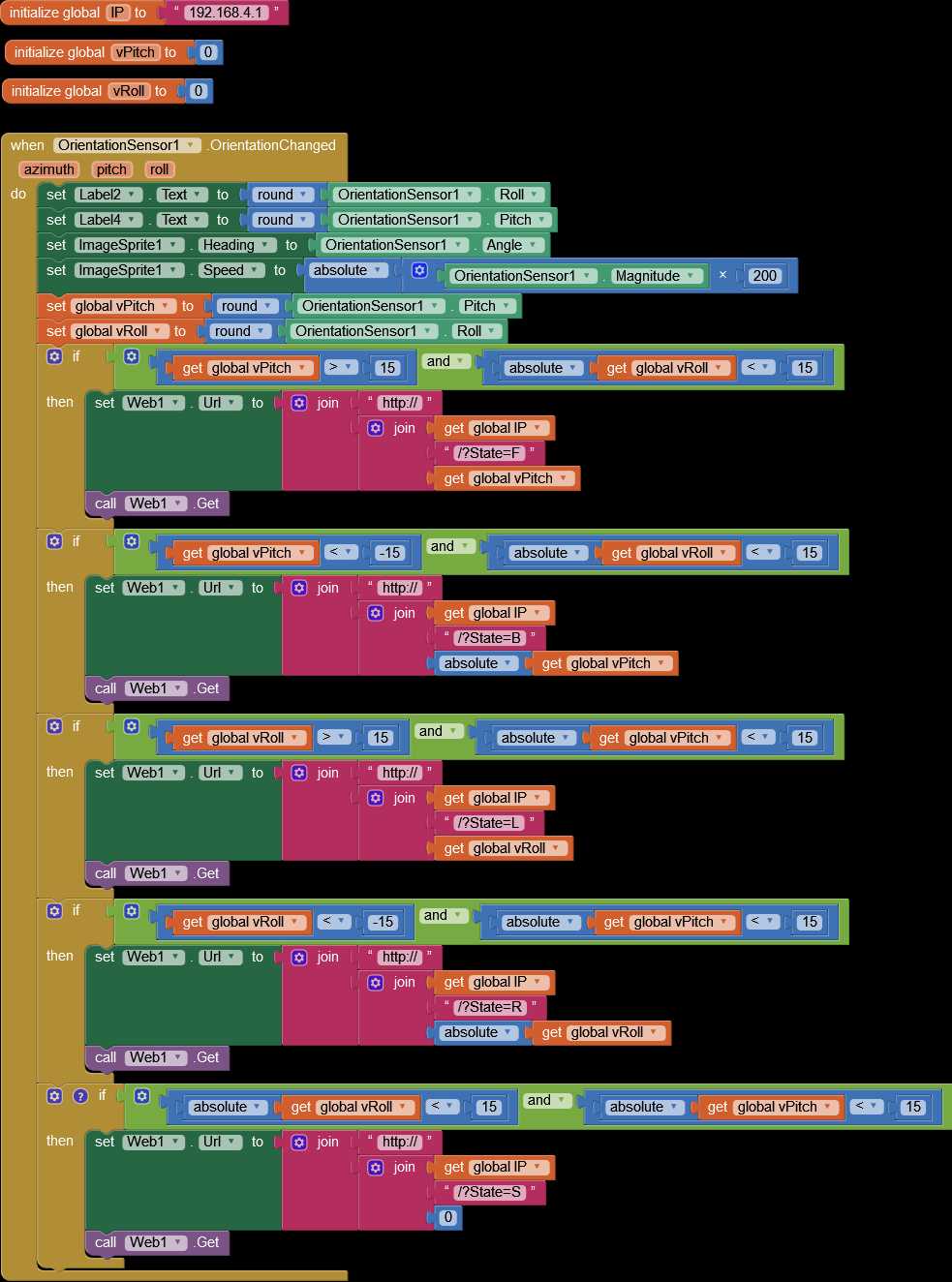 if (command == "F") goForward(); else if (command == "B") goBack(); else if (command == "L") goLeft(); else if (command == "R") goRight(); else if (command == "S") stopRobot(); }