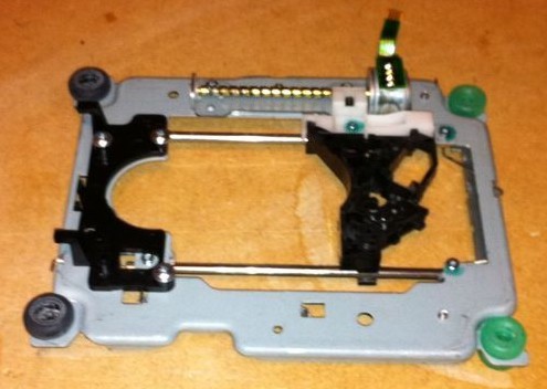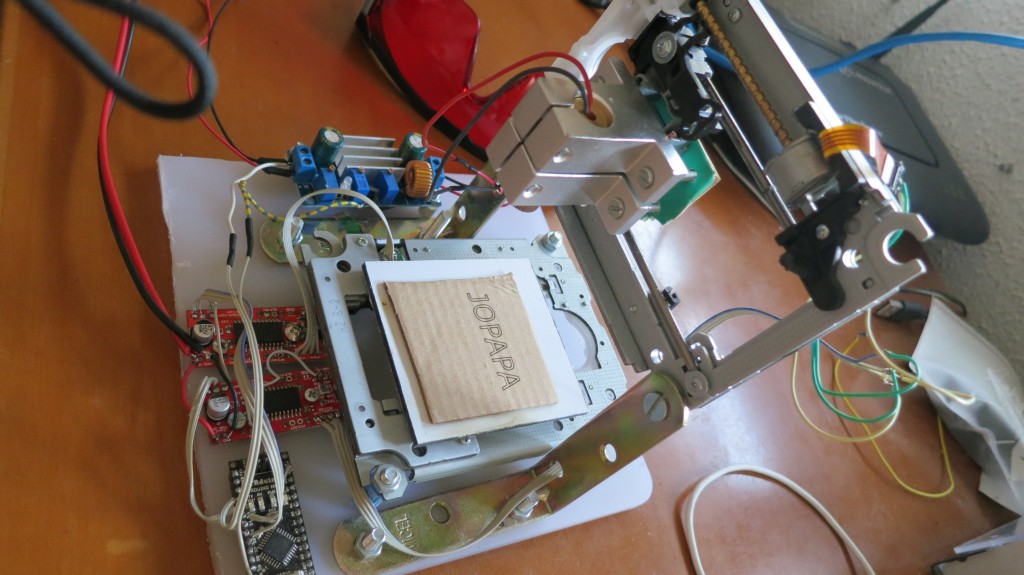 Para su construcción se han usado dos "correderas" extraidas de CD o DVD. Tiene un motorcito del tipo paso-paso que permite movimientos con gran precisión. El laser esta unido al eje X y la base al Y.