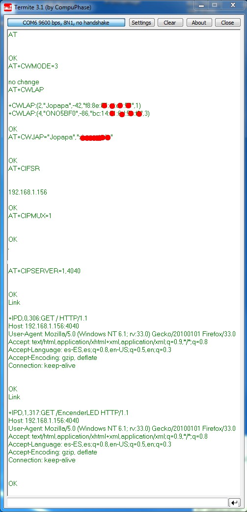 Si por ejemplo ponemos 192.168.1.xx:4040/EncenderLED, recibiremos esta última cadena en la salida serie, lo que nos permite conectándolo a la entrada serie de un microprocesador detectar la cadena y realizar la accion correspondiente.