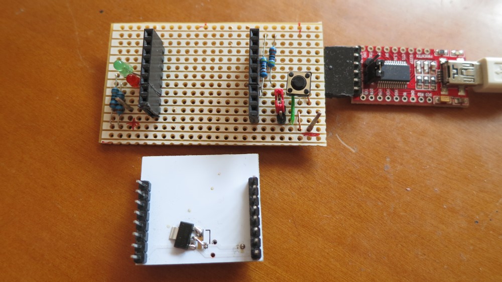Se da por supuesto que se sabe cargar dicho firmware. Se ha utilizado el esp8266 modelo esp-12, ya que tiene todos los pines disponibles, incluso uno analógico. El módulo lo he montado sobre una placa de prueba que me permite simular una entrada con un pulsador, salidas LED para control y cargar firmware con un puente y un conector para el USB/Serie. El propio esp-12 esta soldado a otra placa que facilita esta conexión y el añadirle un integrado ams1117 para 3,3v lo que permite alimentarlo sin miedo con voltajes superiores. ¡¡Ojo!!, esta placa tiene un error y el ams1117 tiene que montarse "atravesado" y con un puentecito y NO como las pistas dan a entender. También hay que desoldar una resistencia marcada con 000 (cero ohmios) que hace de puente y es necesario eliminar.
