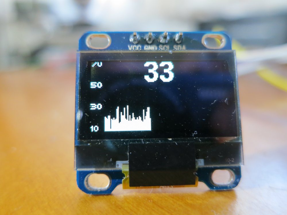 tempvi=vi for vi=2,97,1 do ctop=(74-arrayCPM[vi]) --pone el cero a -X en la base del display (65+X) disp:drawVLine(e, ctop, arrayCPM[vi]); --left,top,height e=e+1 end vi=tempvi e=13 disp:setFont(u8g.font_6x10) disp:setFont(u8g.font_fub20) disp:drawStr( 50, 19, tostring(maxCPM)) --left,top end