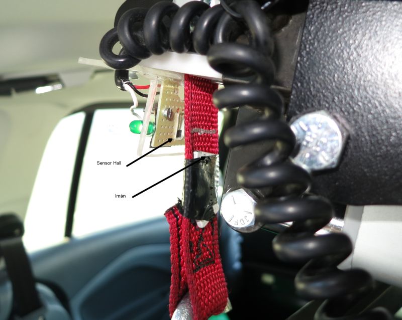 La grúa tiene finales de carrera que pueden ser programados por el instalador en las funciónes de sacar y meter el brazo, pero no en la subida de la cinta que eleva la silla y si nos pasamos de subida, ocasionaría una desagradable avería. Se soluciona poniendo un detector HALL (sensible al magnetismo) en la punta del brazo y un imán (de neodimio) pegado a la cinta. Cuando el imán llega al sensor Hall, el microprocesador detiene la cinta (pero no en el mando manual). Esto es así porque la cinta nunca esta en la misma posición exacta y no podemos determinar con precisión los segundos de subida, simplemente ponemos de mas y el sensor la detiene y el programa continua con la siguiente orden.