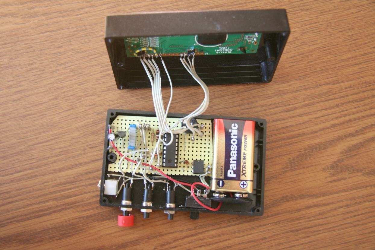 Gracias al uso de un microprocesador, el circuito es muy simple. Un PIC 16F88, un optoacoplador 4N25, una pantalla de dos líneas y 16 caracteres, 7 resistencias, dos condensadores y un regulador de voltaje.