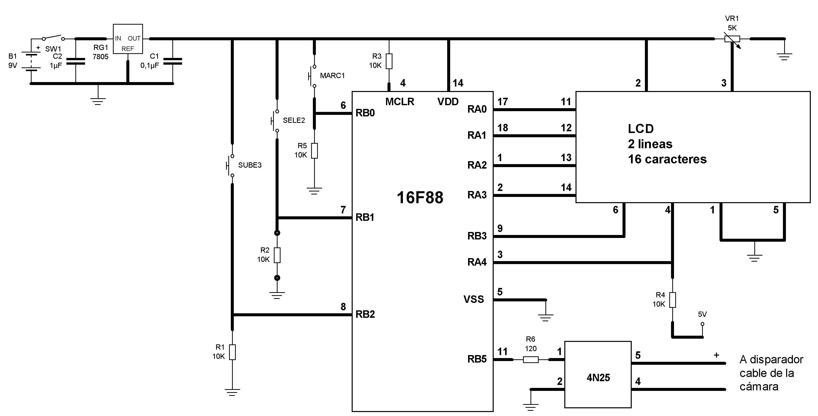 Sistema con microprocesador para realizar fotografías a intervalos desde un segundo a 24 horas con programación del número de disparos a realizar.