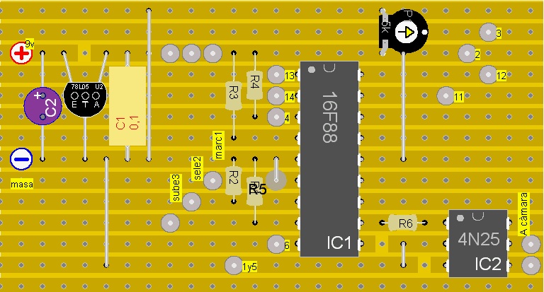 Recordar que hay cuatro cortes en las pistas, uno junto al 78L05, dos mas entre el PIC y el 4N25 y otro bajo R6. Y por supuesto el corte bajo los dos integrados que separan sus pines. También fijarse en los cuatro puentes. El LCD y los pulsadores (de buena calidad) se sueldan a la placa por medio de cablecillos y espadines. En un circuito de baja frecuencia no hay componentes críticos ni se necesitan disposiciones especiales.