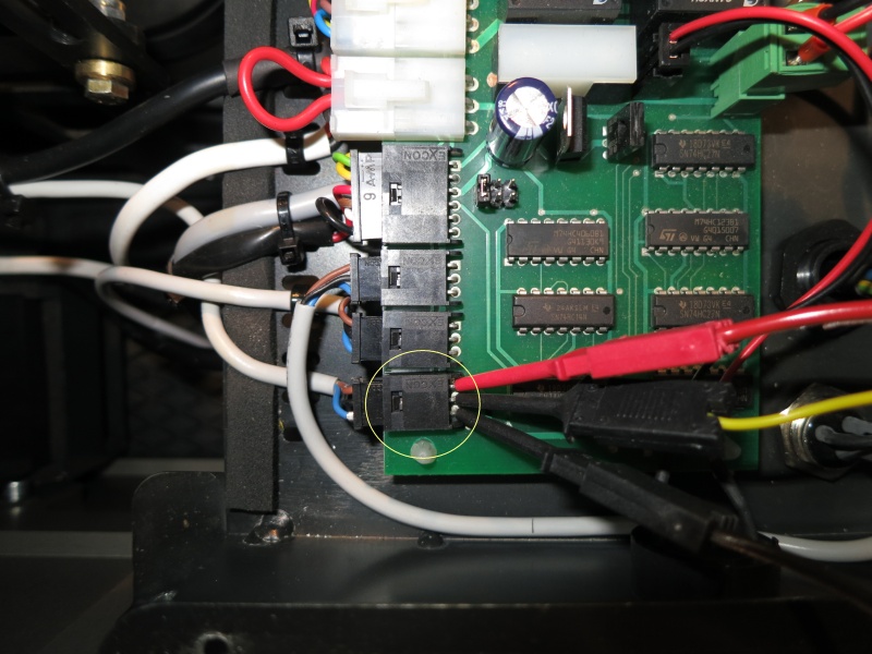 En un círculo vemos el conector a intervenir con mis puntas de prueba explorando. Soldaremos dos hilos (corresponden a las puntas de prueba roja y amarilla) y que van al pulsador a través de una resistencia de 470 ohmios que esta soldada junto al pulsador (círculo amarillo).