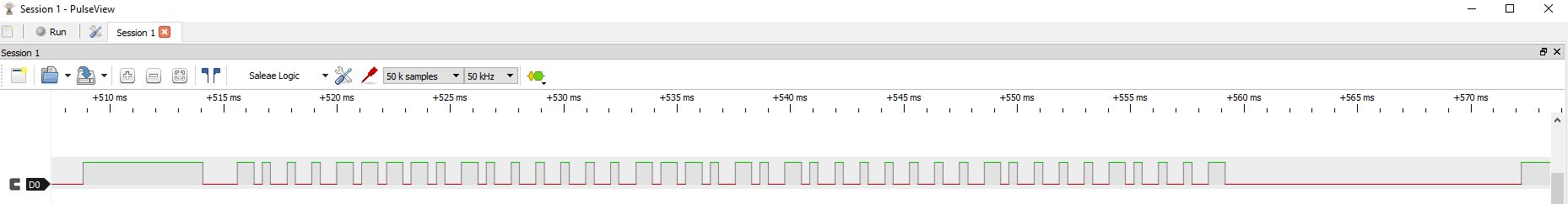 Lo siguiente fue conectar la salida de un módulo receptor de 433Mhz al osciloscopio donde podía verse perfectamente la trama pero lógicamente con muy difícil lectura de los tiempos de cada cambio lógico. Era el momento de desempolvar un analizador lógico que monté en el 2015 por menos de 5€. Actualmente se vende ya montado por ese precio y con solfware gratuito PulseView.