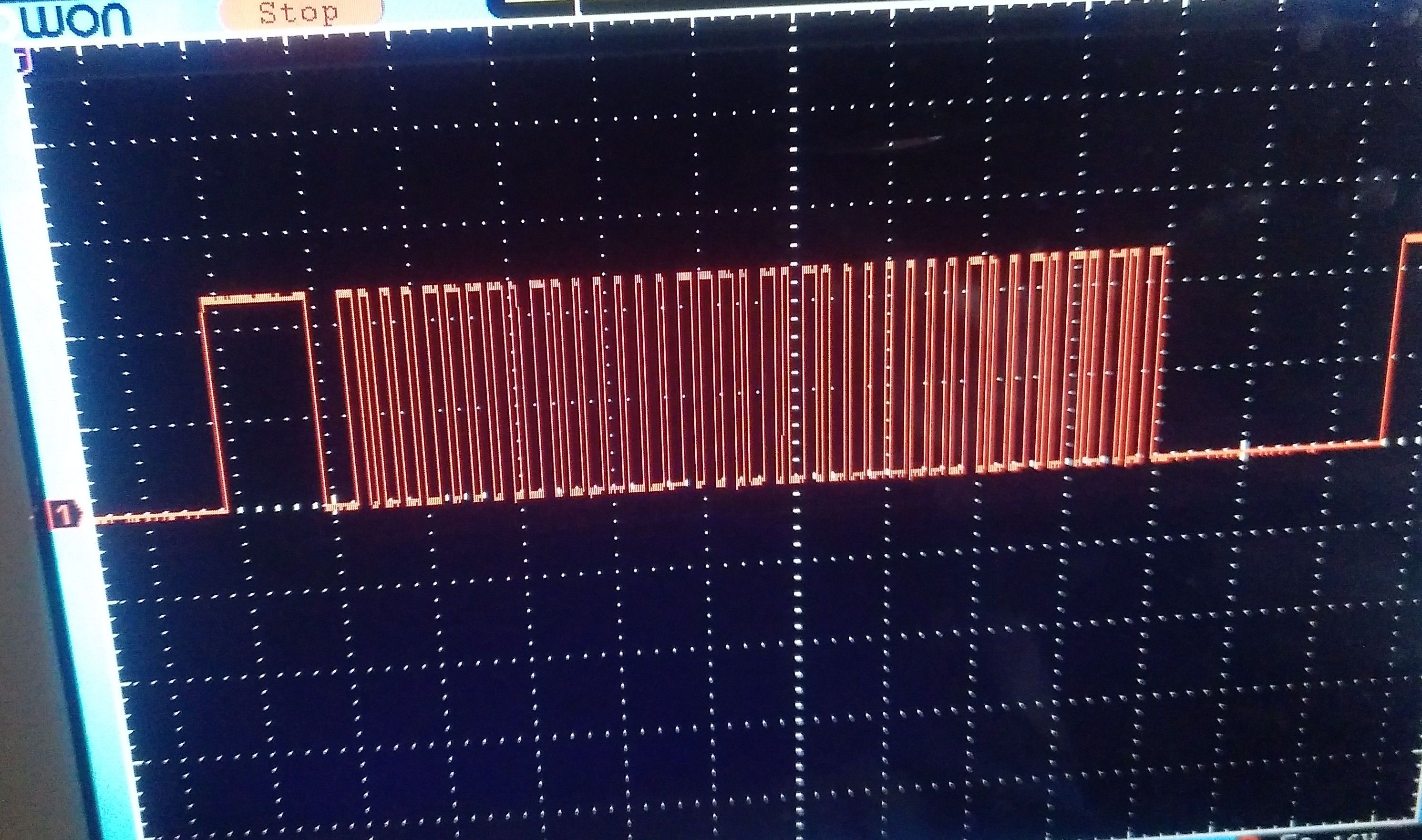 En concreto y en esta caso hay un primer pulso de 5,1 Milisegundos + valle de 1,7mSeg y después los unos miden 400microSeg y los ceros 350microSeg. Por supuesto también hay niveles lógicos dobles. Además hay una separación entre tramas de 13mSeg.