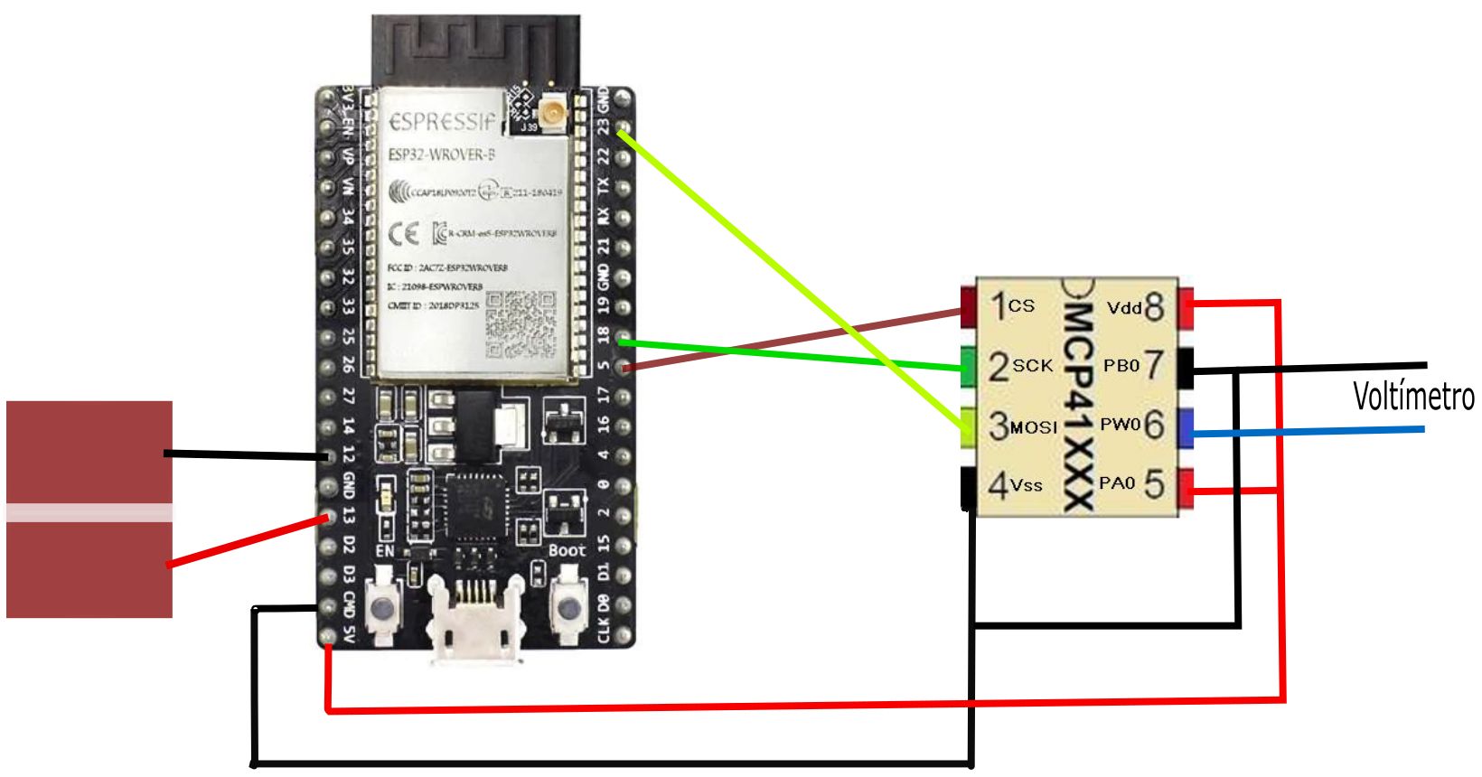 En este montaje he usado como SPI un ESP32, mas que nada por usar sus posibilidades de control táctil. El MCP41010 tiene tres pin 5,6 y 7 que corresponderían a las tres de un potenciómetro mecánico. En ellas podemos lee la resistencia que se genera. En este caso, he conectado los extremos (5 y 7) a 3,3v y masa, lo que hace que en pin 6 tengamos las variaciones que corresponderían a un divisor resistivo y que leeremos con un voltímetro.