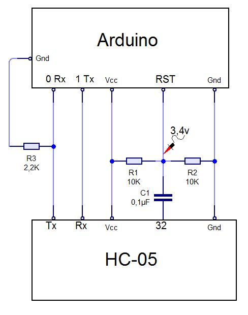 Es necesario hacer un pequeño circuito para que el pin 32 del HC-05 pueda mandar correctamente un pulso negativo al pin reset del Arduino.