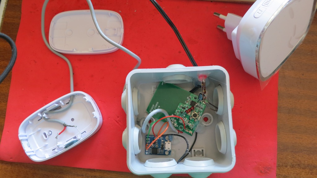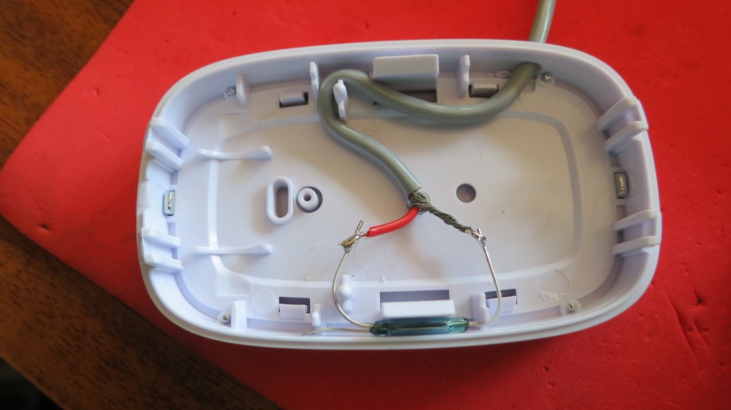 El montaje en su caja. La base del transistor a P1 con una resistencia de 1k y colector y emisor para cerrar contactos del pulsador del timbre. He añadido un LED con su resistencia en paralelo con la alimentación para facilitar la colocación del imán, si está bien colocado, el circuito no tiene alimentación y el LED estará apagado.