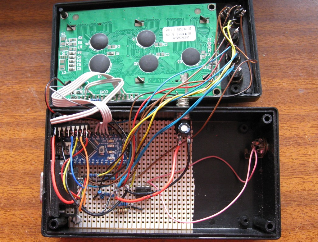 El montaje final. Uso un Arduino Nano. El display y el ULN2003 soldados directamente. Abajo a la derecha el optoacoplador 4N25; ojo, la salida tiene "polaridad", si la cámara no dispara, invertir las conexiones.
