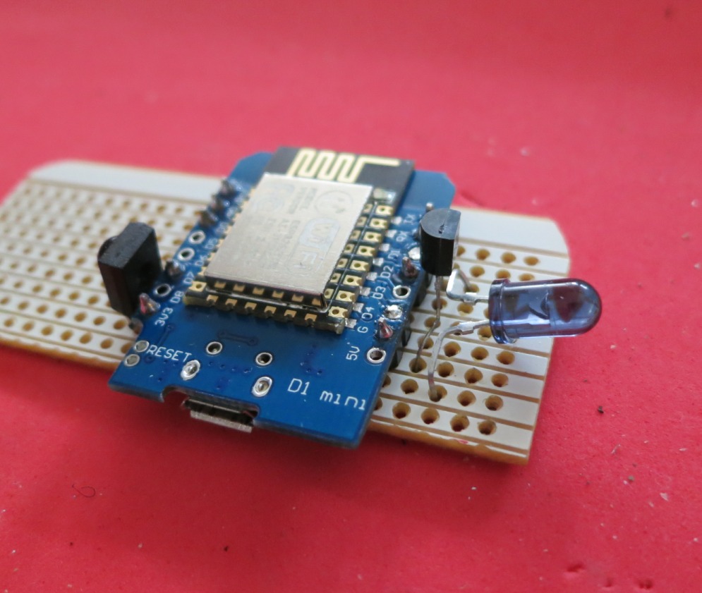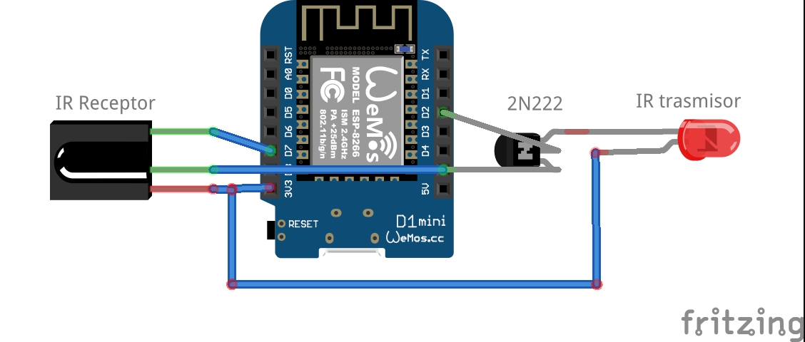 El montaje es minimalista, una placa WeMos mini, diodo IR, transistor 2N2222 y receptor de IR para leer los códigos de nuestro mando a distancia. Esto incluso lo podremos ahorrar si el TV es Samsung ya que están en el Sketch de Arduino que pongo más abajo.