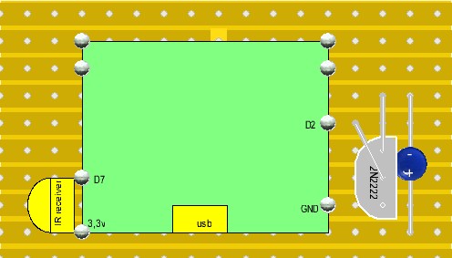 A la izquierda el circuito y a la derecha la placa de tiras. Advertir que las dos tiras de 3,3v y GND no están cortadas y dan servicio la de 3,3v al IR receptor y al diodo emisor y la de GND al 2N2222 y al IR receptor. Por tanto, los pines izquierdo de GND y al derecho de 3,3v no hay que ponerlos, Solo hay que soldar los cuatro pines inferiores, los cuatro superiores solo están para dar más solidez al conjunto.