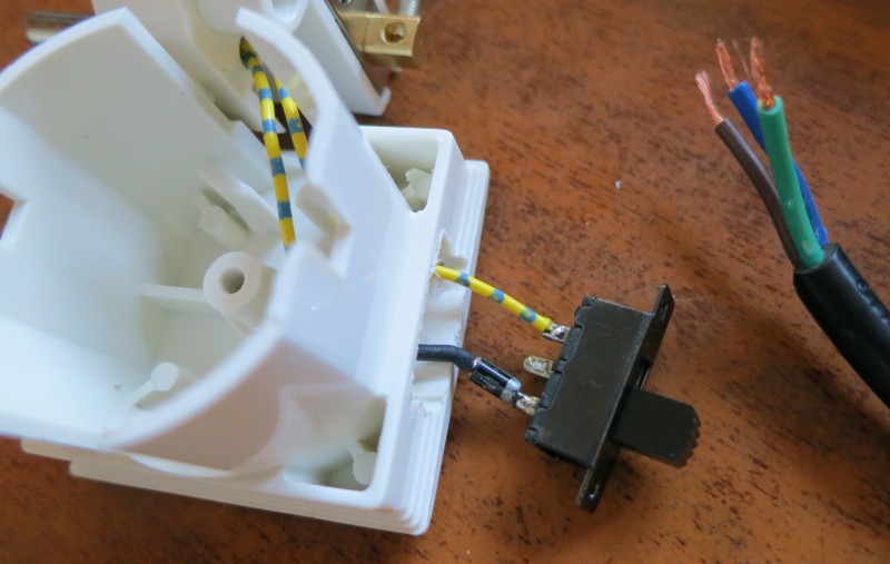 En un lado del conmutador el diodo (da igual la polaridad) y en el otro directo . Ambos van a uno de los enchufes. En el centro irá el cable al soldador, el marron o el azul. El verde es la toma de tierra.