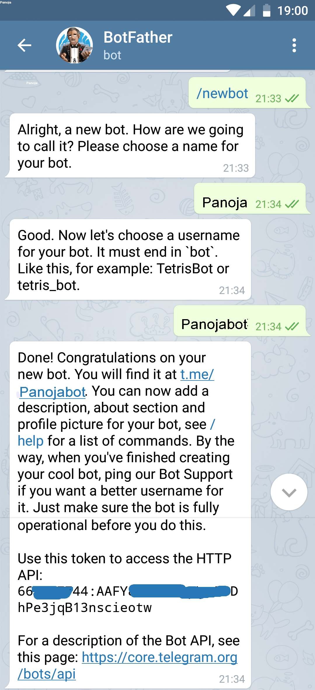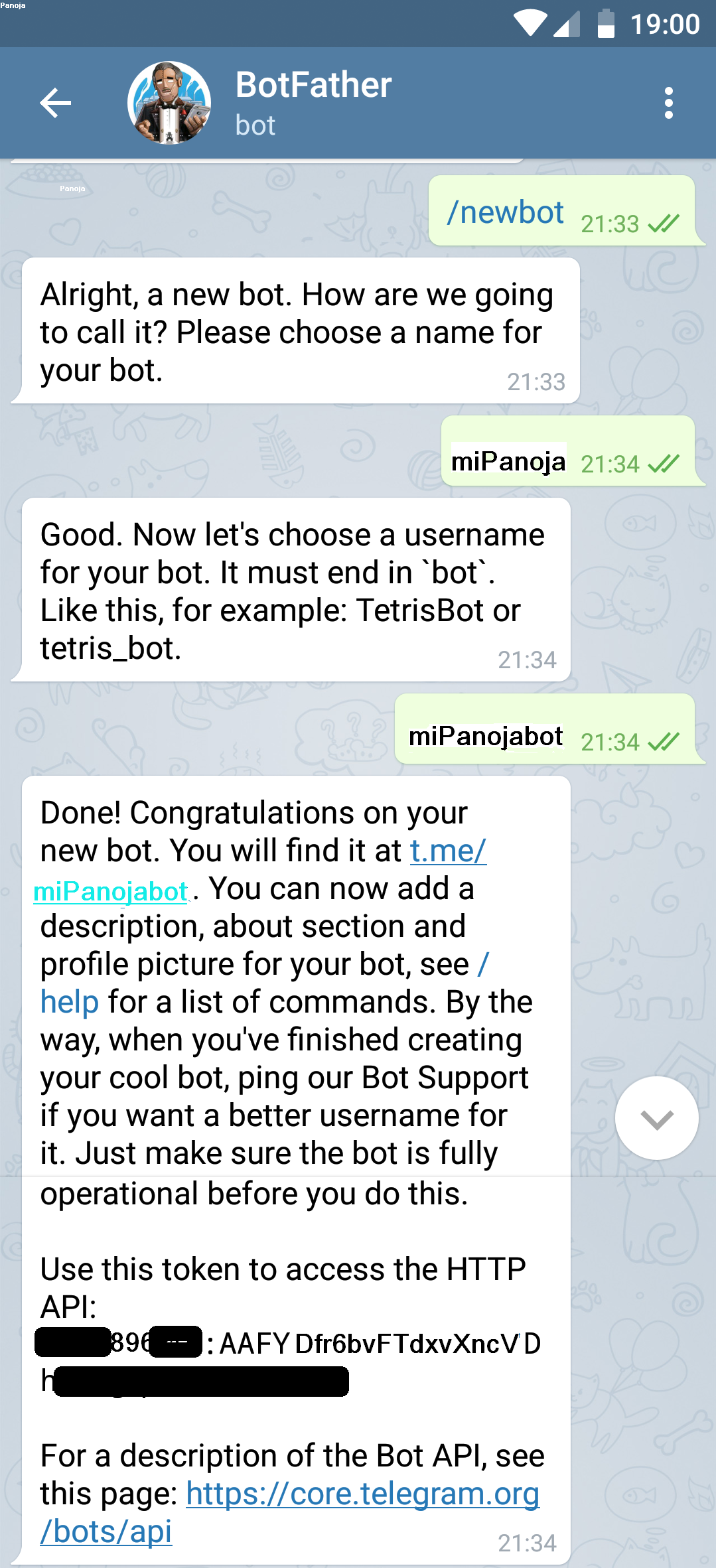 Con esto disponemos de todo lo necesario, el token del segundo bot (miPanojabot) y el chat_id del primero. Por tanto podremos enviar mensajes desde Panoja a miPanoja.