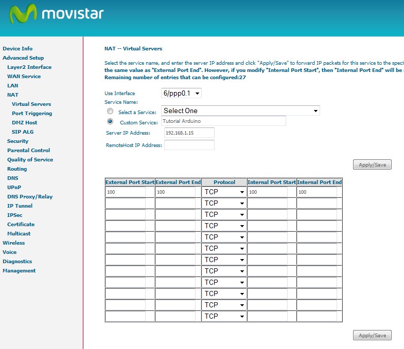 Cada router es diferente. Tenemos que buscar el lugar donde se redirigen los puertos a cada IP interna. En mi router Comtrend está en la opción Virtual Server, ahí decimos que IP vamos a direccionar y que puerto interno y externo a nuestra LAN. En un Linksys esta como Single Port Forwarding
