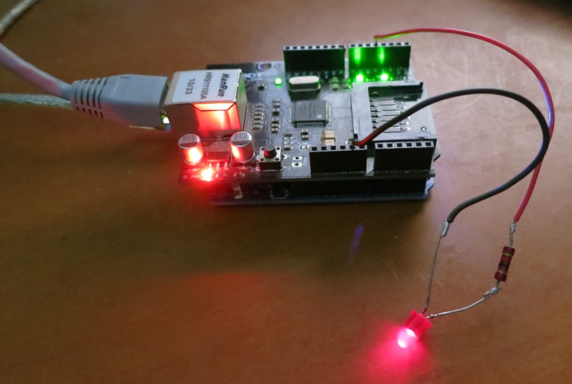 1.-Hardware: En plan básico, necesitamos un Arduino Uno y una placa Ethernet (Ethernet Shield W5100). Hay otros tipos de placas e incluso soluciones Wifi. Para el ejemplo, conectamos la placa al router y en el pin 4 un diodo LED con su resistencia.